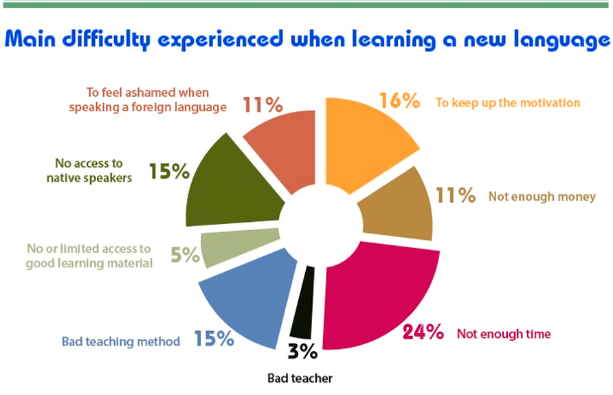 “To keep up Motivation” is listed as excuse #2 with 16% in the above referenced chart. Ads on TV or radio of happy people communicating in foreign countries or promoting how easy it is to learn a new language may even induce you to give language learning a try.